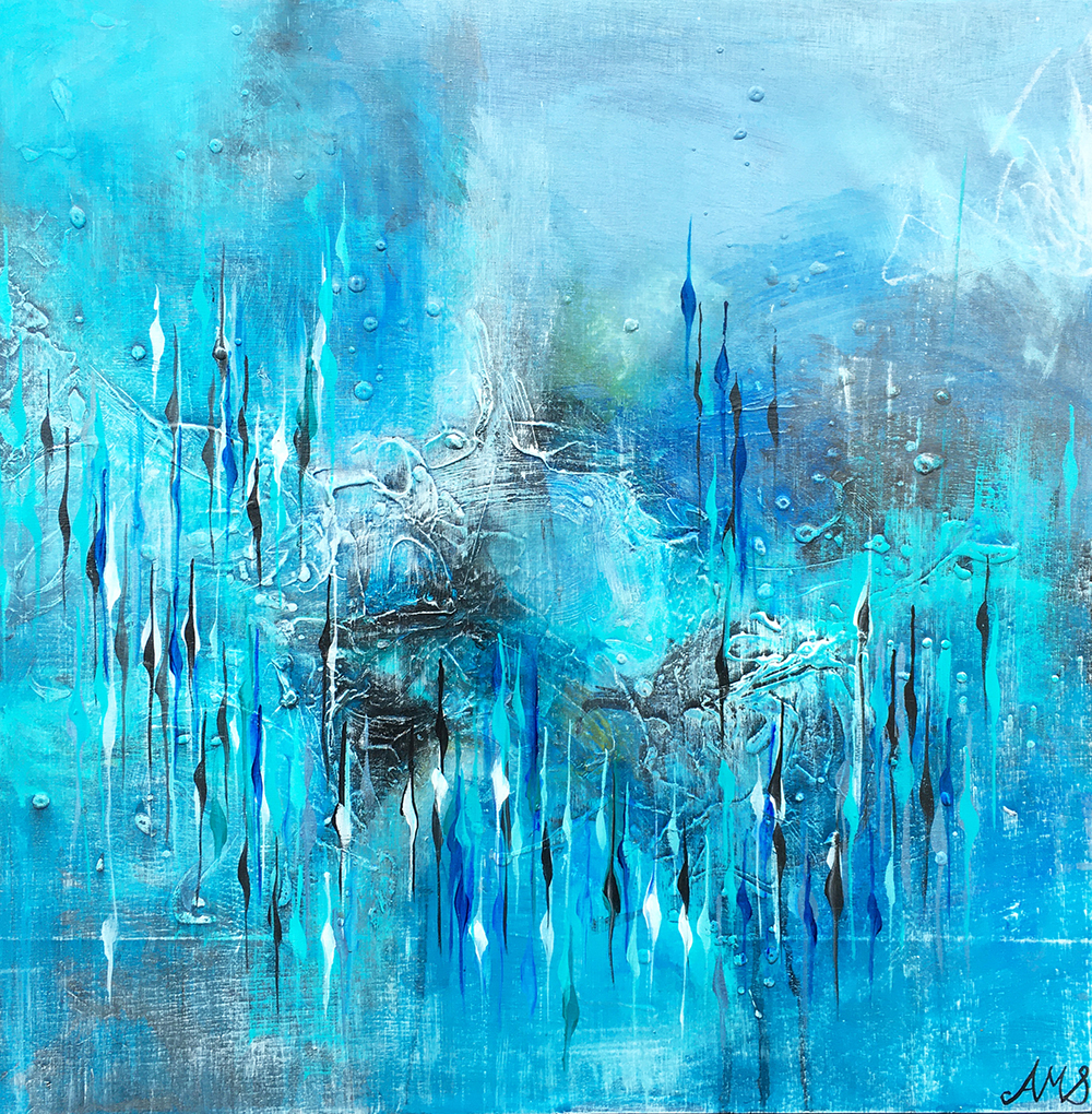 In deep blues, turquoise and teals, this painting represents the little explored hidden depths of our extraordinary planet, and questions the mysteries of what lies beneath.